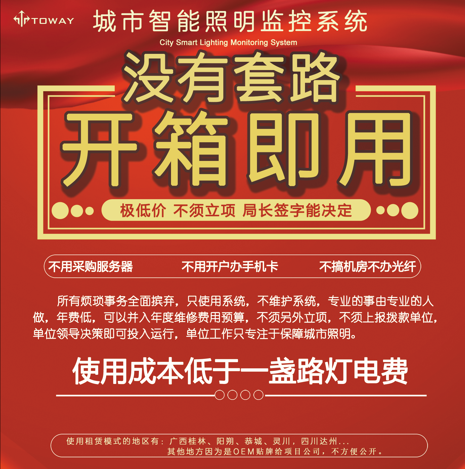 此方案對(duì)于一個(gè)縣城100臺(tái)路燈配電箱的體量,首年開(kāi)支也只有三萬(wàn)五千元,此后每年費(fèi)用是兩萬(wàn)五,本方案最大的優(yōu)點(diǎn)就是費(fèi)用低廉,這筆費(fèi)用完全可以并入年度維護(hù)撥款中核銷(xiāo)。且不會(huì)有設(shè)備過(guò)保要重新采購(gòu)的問(wèn)題出現(xiàn)。
